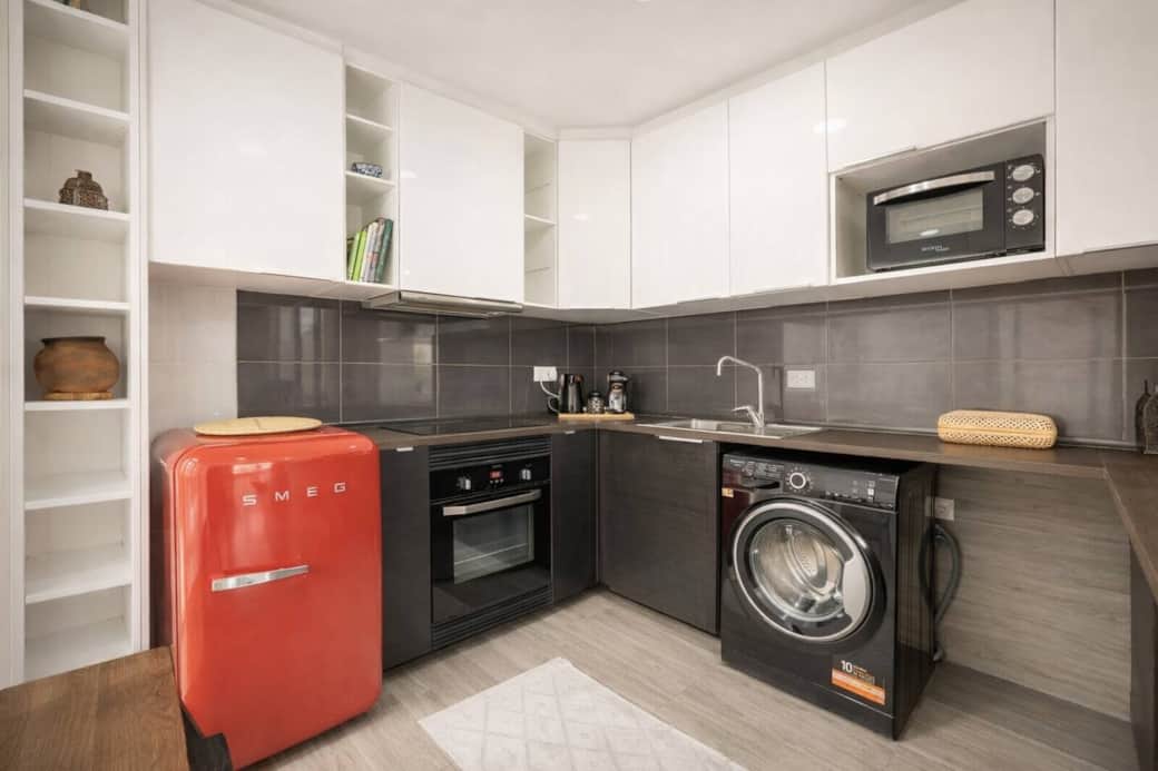 The fully equipped kitchen includes modern appliances, essential cookware, and a washing machine for added convenience.